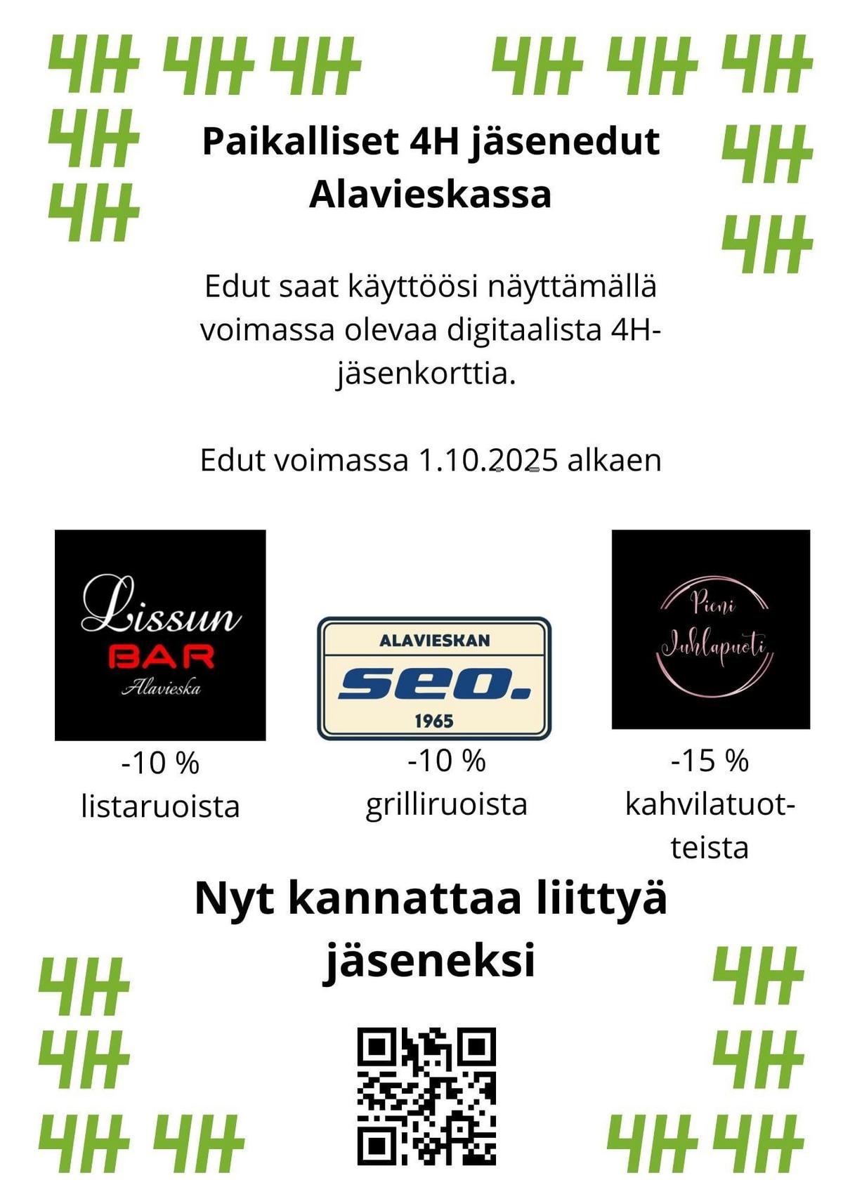 Edut saat kun olet Merijärven 4H.n jäsen ja maksanut jäsenmaksun. Uudet jäsenetu liikkeet löytyvät jäsenkortilta 1.10.2025 alkaen: oma.4h.fi